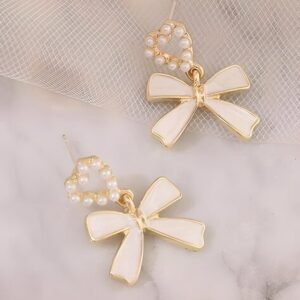 Elegant Pearl Bow and Heart Drop Earrings – Lustrous Mother-of-Pearl Accents for Women