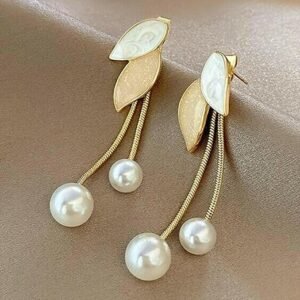 Elegant Double Pearl and Leaf Stud Earrings – Versatile Gold-Tone Earrings for Women & Girls